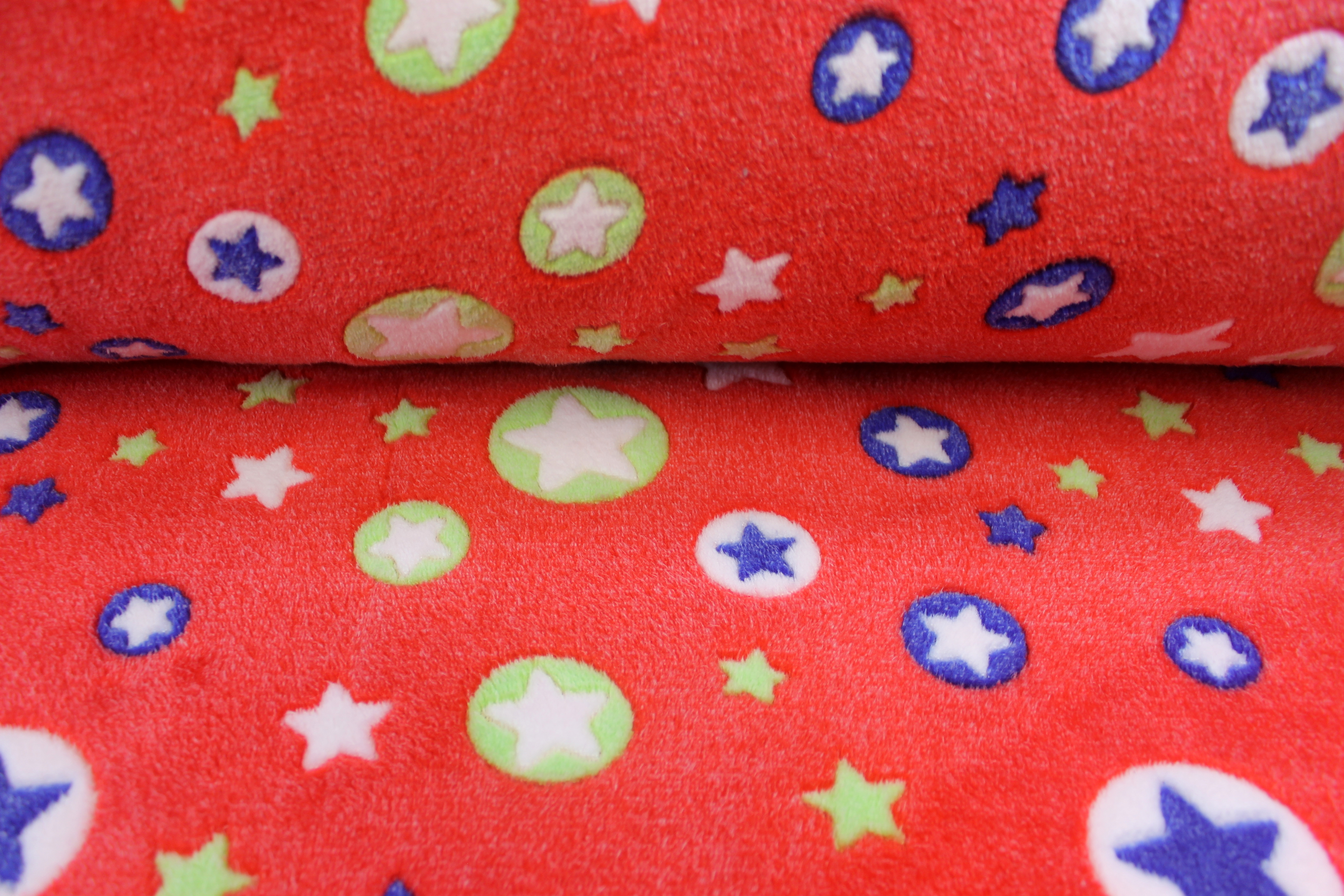 Wellnessfleece | bedruckt | bunte Kreissterne | rot